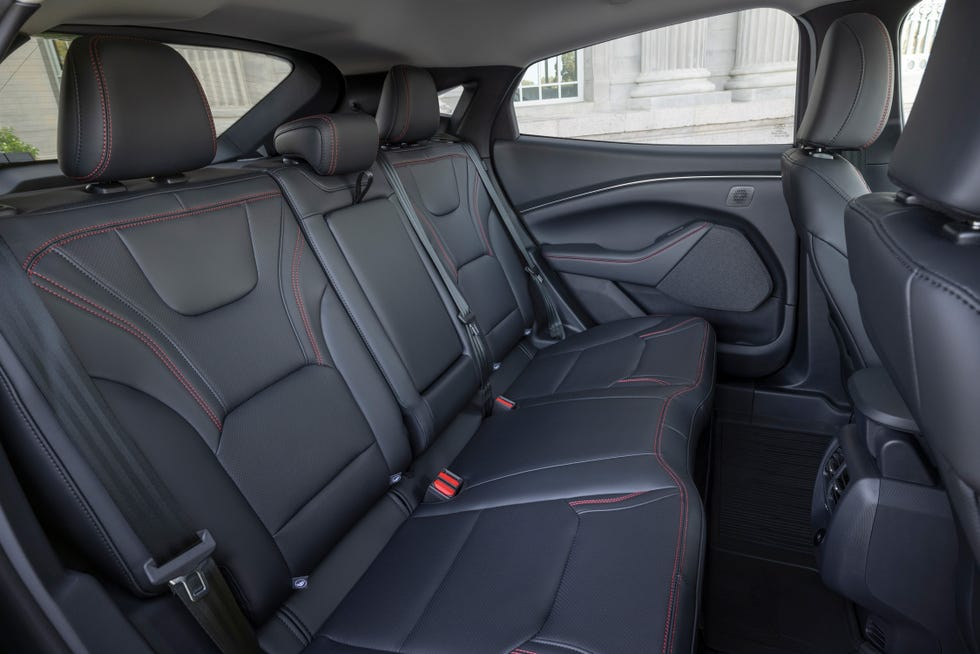 Côté confort, le Mach-E propose des sièges avant bien rembourrés et ergonomiques, disponibles avec fonction chauffante et ventilée, garantissant un confort optimal en toute saison. Les sièges arrière offrent un espace généreux pour les jambes, rendant le véhicule parfaitement adapté aux familles ou aux trajets longue distance. Sur les versions haut de gamme, l’habitacle est habillé de matériaux raffinés, avec des surpiqûres contrastantes et un éclairage d’ambiance personnalisable.